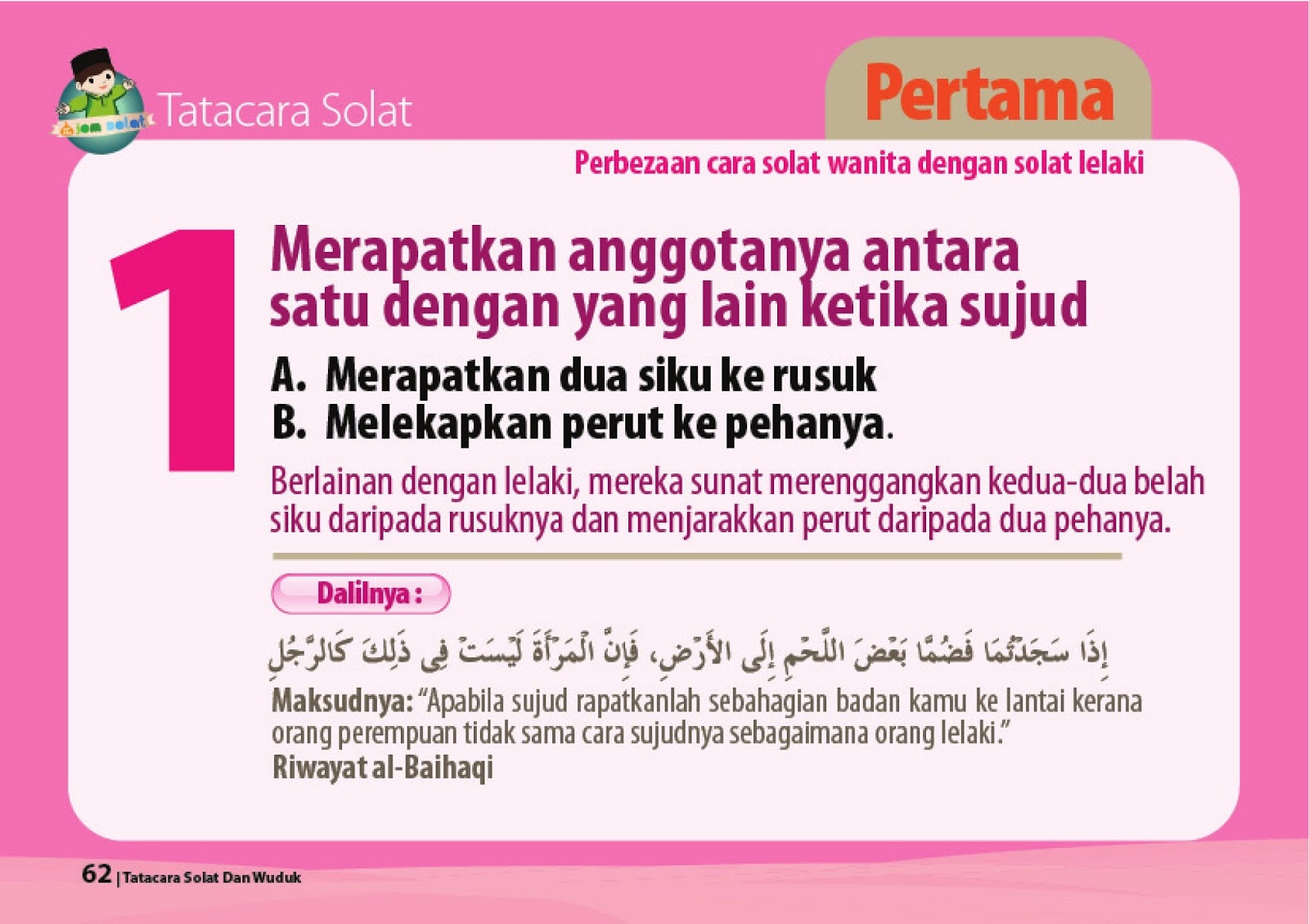 1 menghimpunkan merapatkan sesetengah anggota dengan lain ketika sujud. Kaifiat menunaikan solat dari takbir al ihram sehingga salam merangkumi amalan perkataan dan perbuatan pergerakan. Namun ada perbezaan jarak kaki. Kita dicipta di dunia ini adalah untuk menyembah dan taat kepada allah.