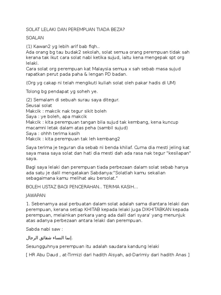 Beza Solat Lelaki Dan Perempuan