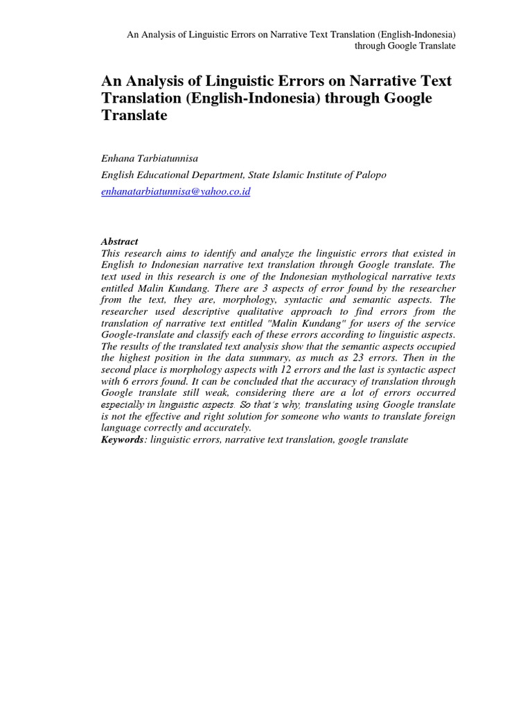 An Analysis Of Linguistic Errors On Narrative Text Translation Through Google Translate Fix Pdf Translations Word