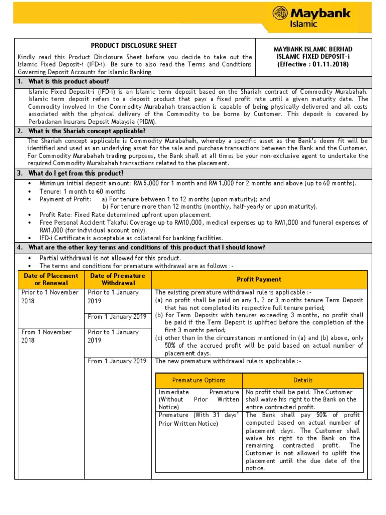 The underlying asset for the sale and purchase transaction between the bank and the customer is based on a specific shariah compliant commodity as the bank deems fit. What do i need to know about maybank islamic fixed deposit i.